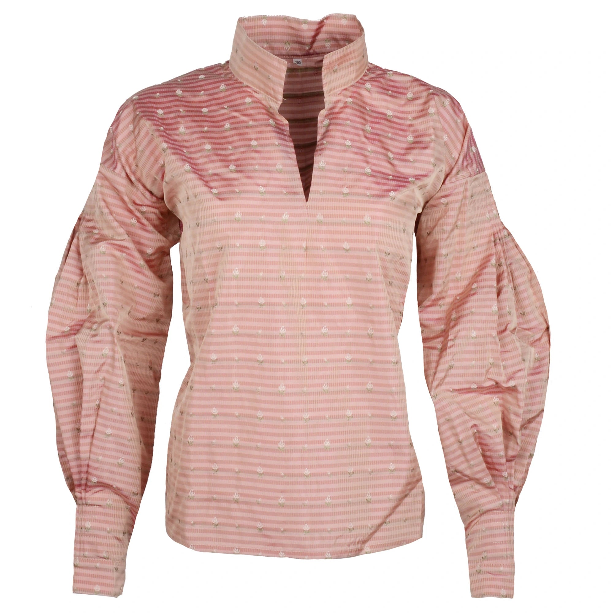 Bunadskjorte i jacquardvevd stoff i 100% silke. Stripete rosa mønster med gule blomster.