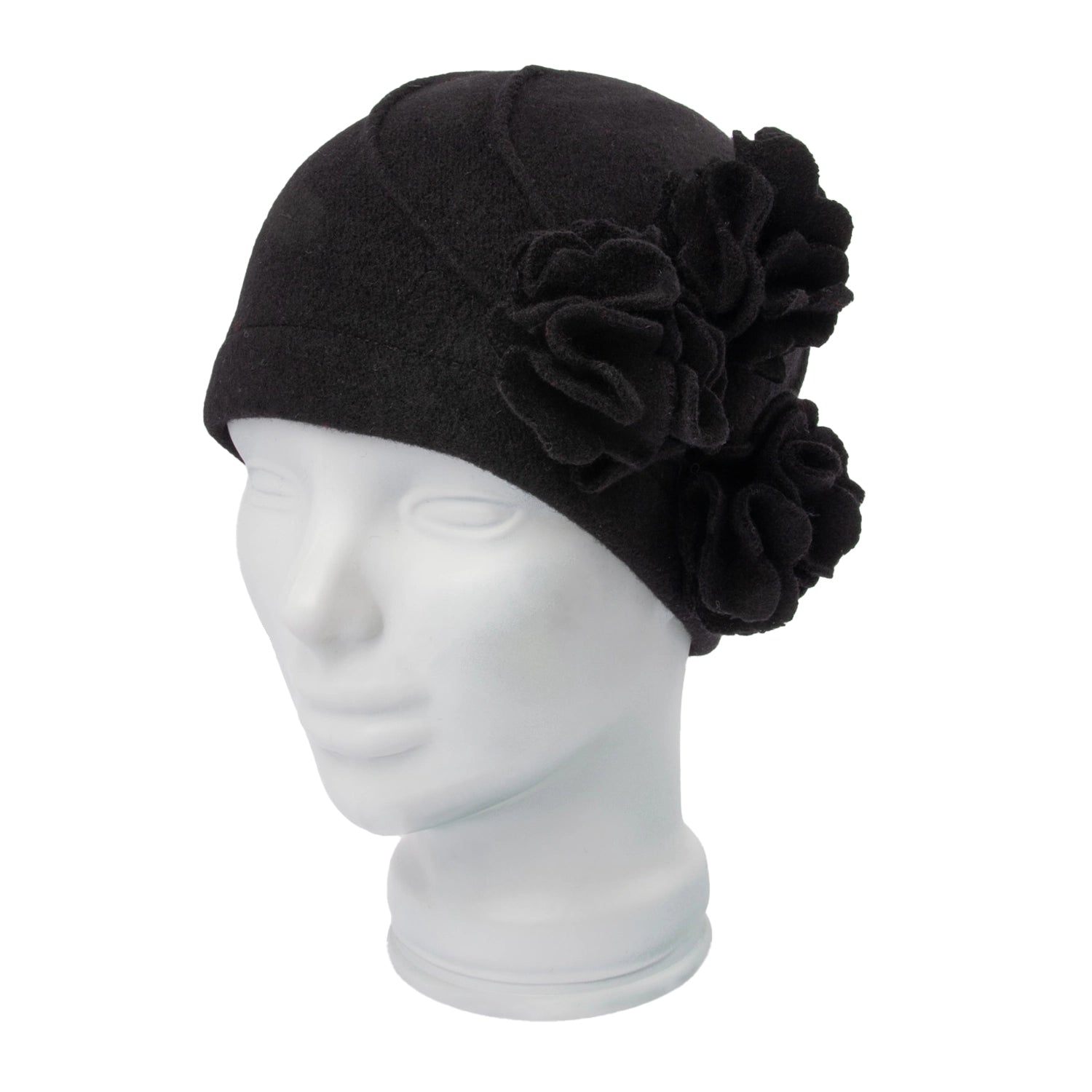 Lue i tovet ull. Påsydd blomsterdetaljer på siden. One size. 100% ull.