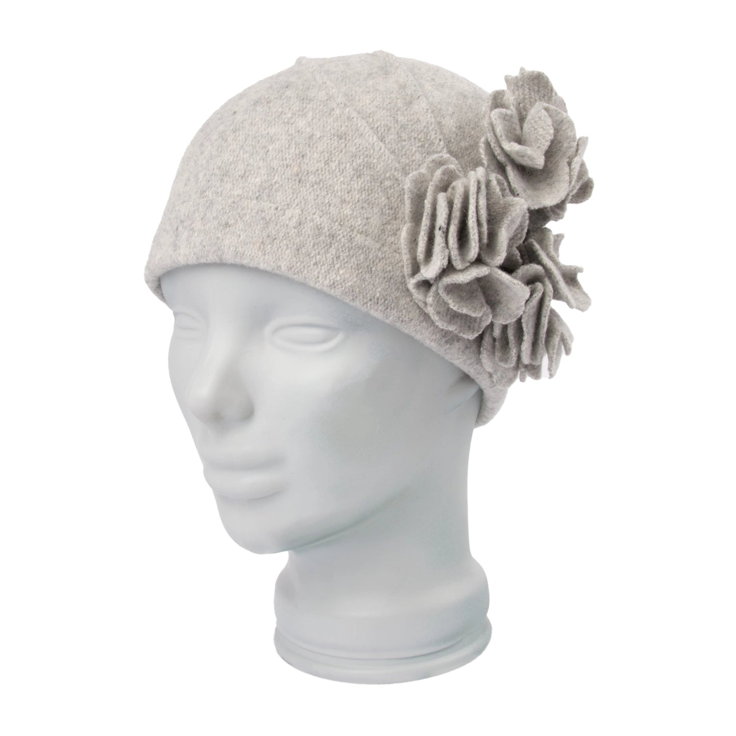 Lue i tovet ull. Påsydd blomsterdetaljer på siden. One size. 100% ull.