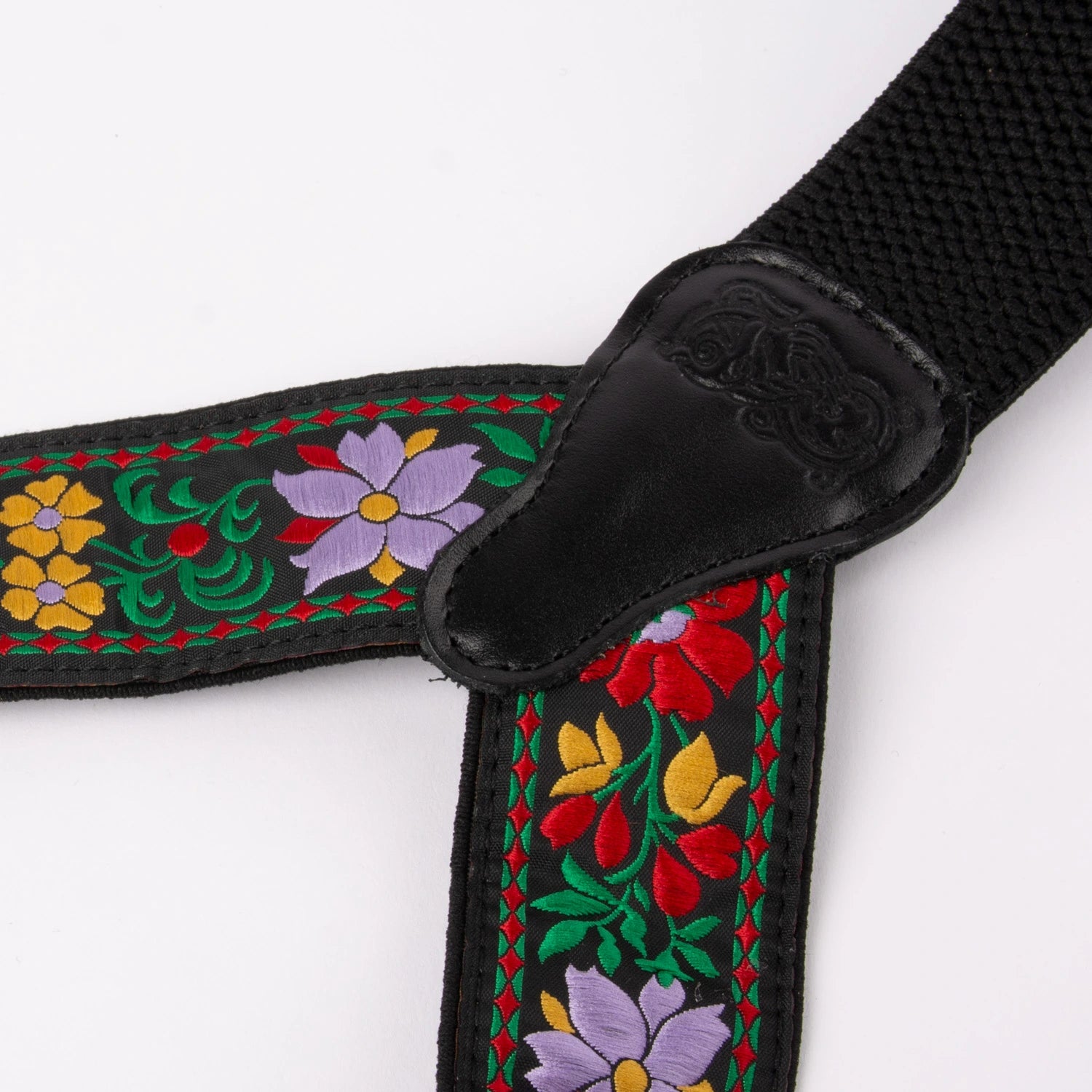 Bukseseler med jacquardvevd bånd. Lengden kan reguleres med sølvbelagt spenne. Elastisk strikk på ryggpartiet.