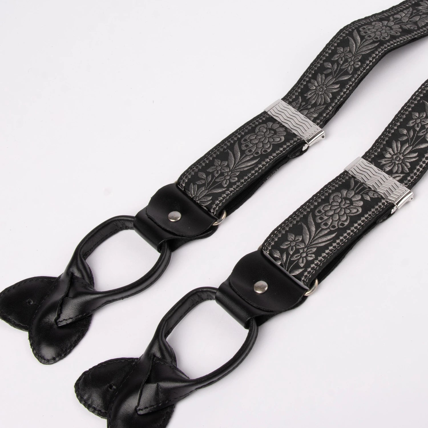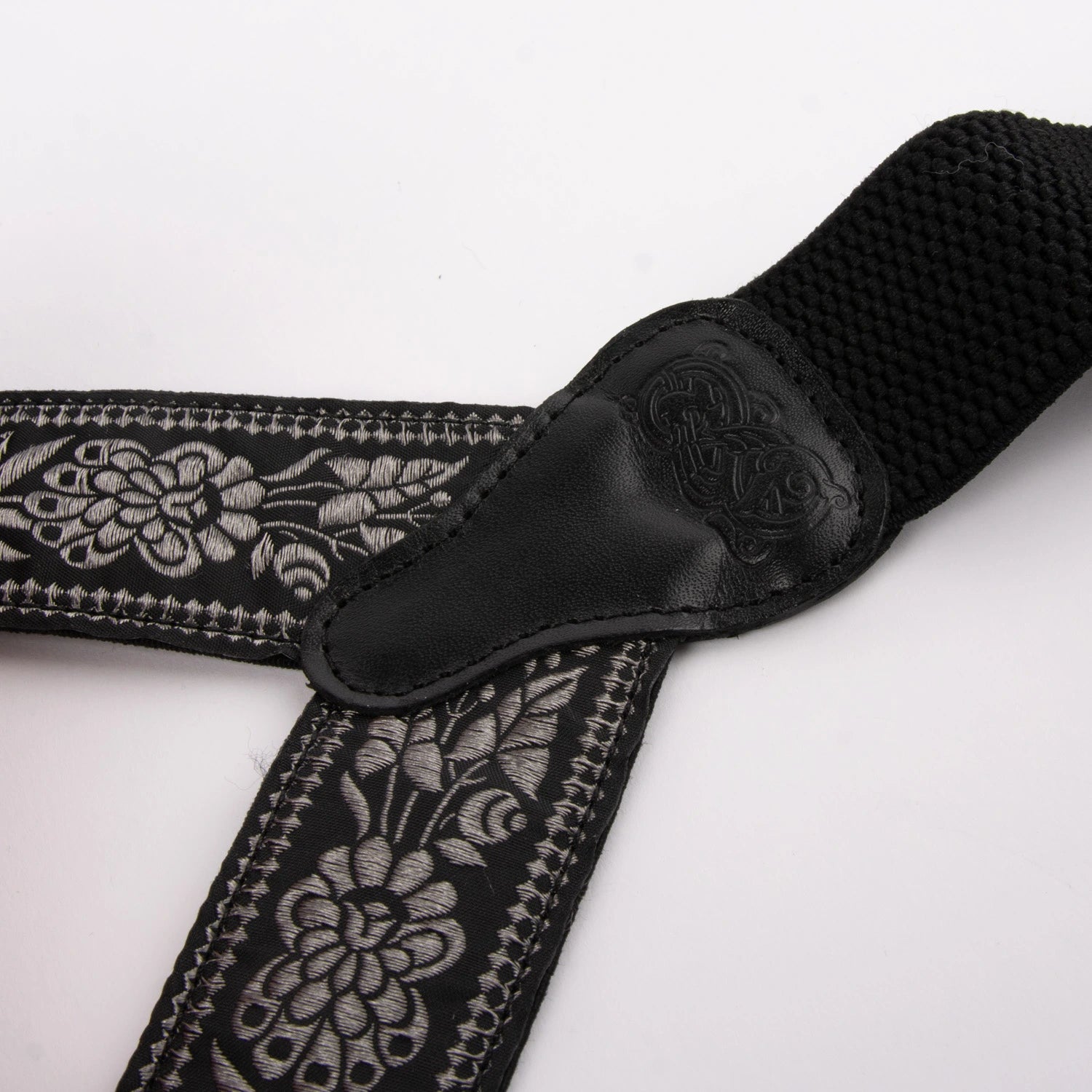 Bukseseler med jacquardvevd bånd. Lengden kan reguleres med sølvbelagt spenne. Elastisk strikk på ryggpartiet.