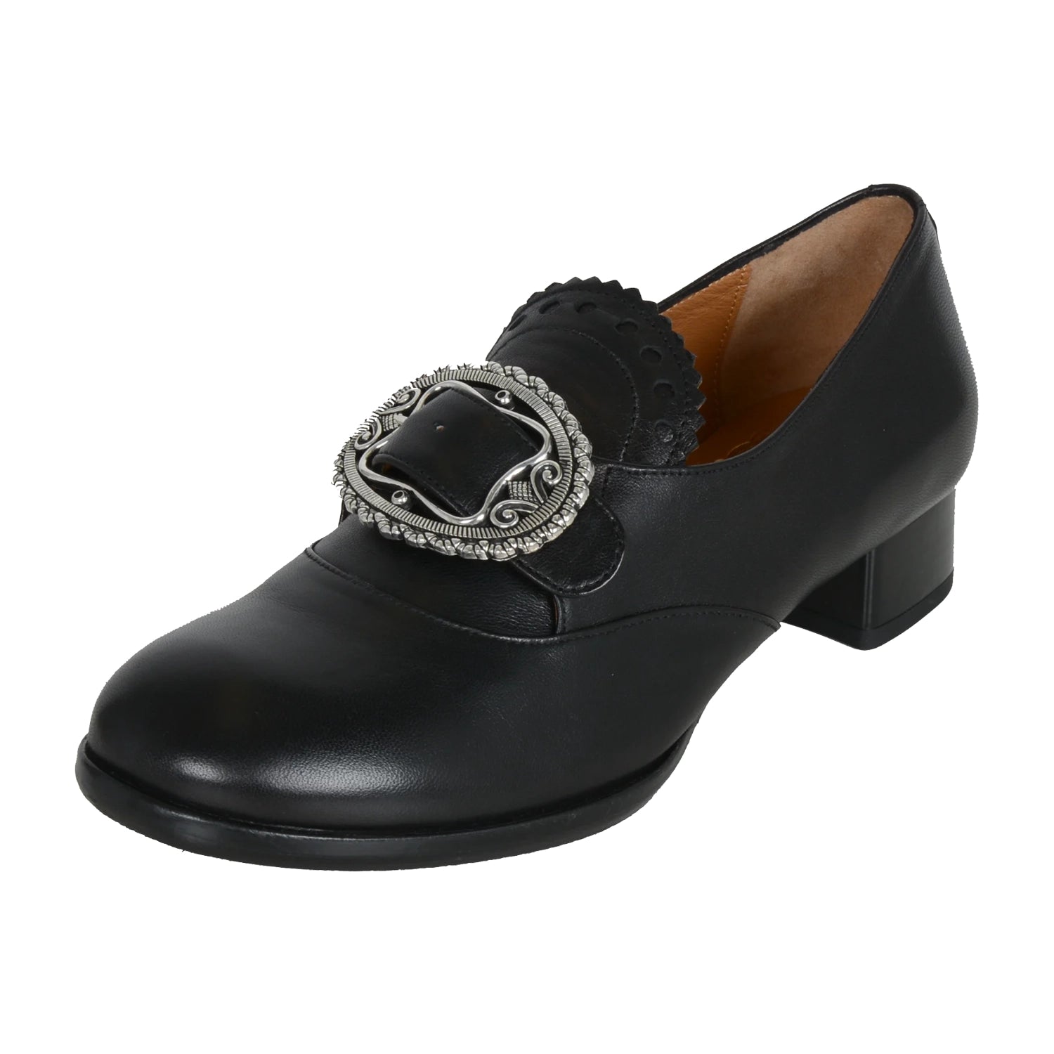 Bunadsko i mykt kalveskinn. Sølvbelagt spenne og høy hel.