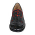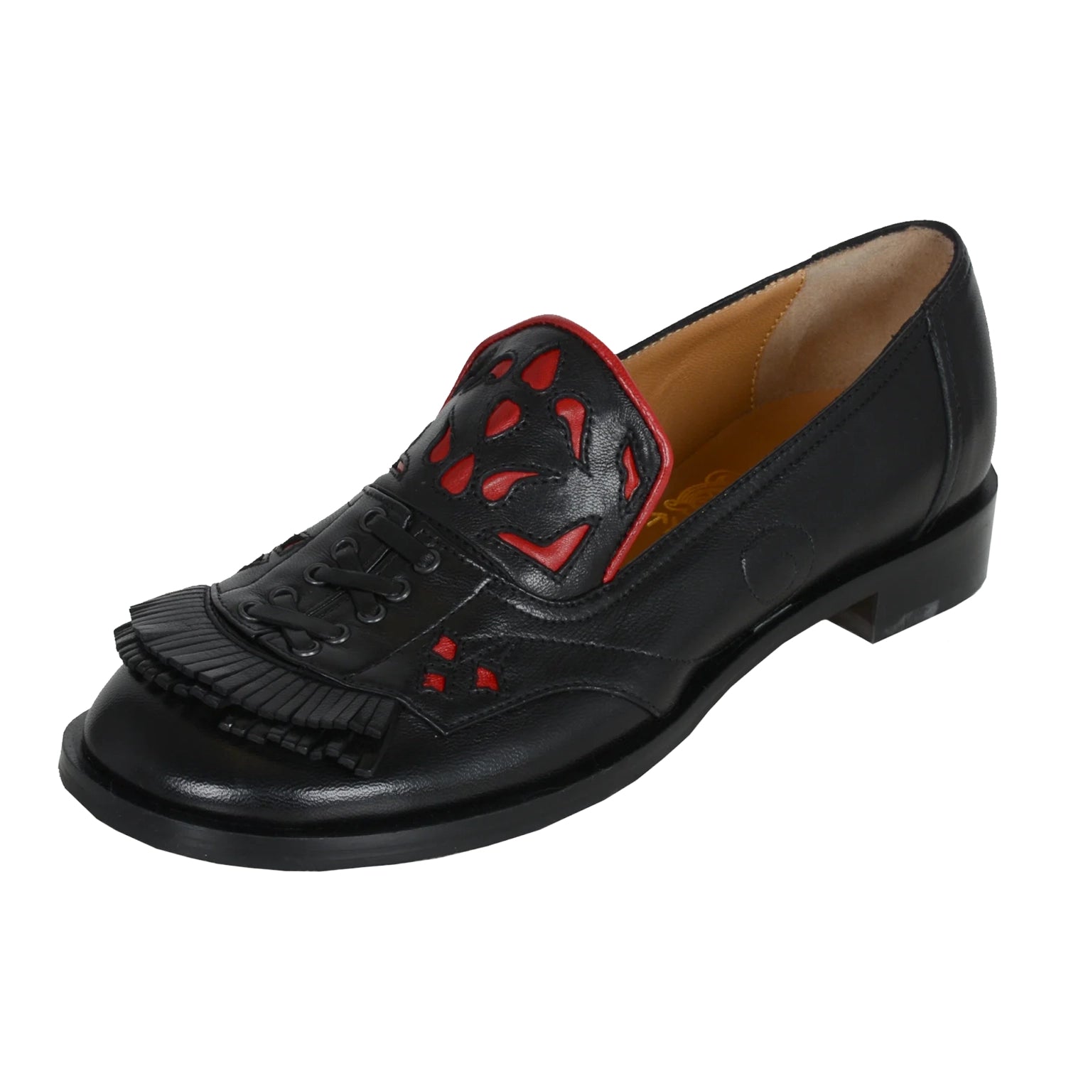 Bunadsko i mykt skinn. Flotte dufser foran og lav hel. Sort skinn med røde detaljer.