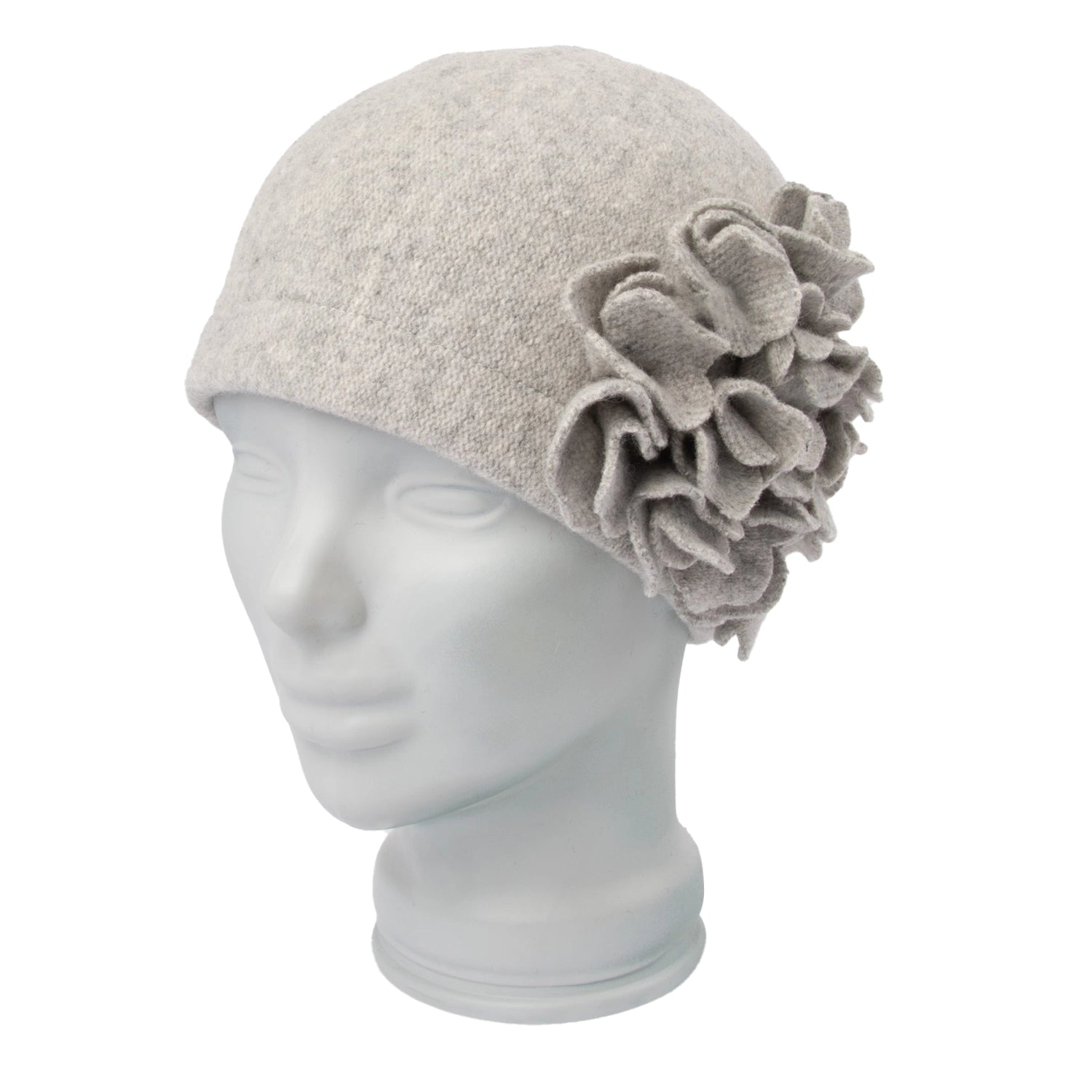 Lue i tovet ull. Påsydd blomsterdetaljer på siden. One size. 100% ull.