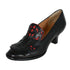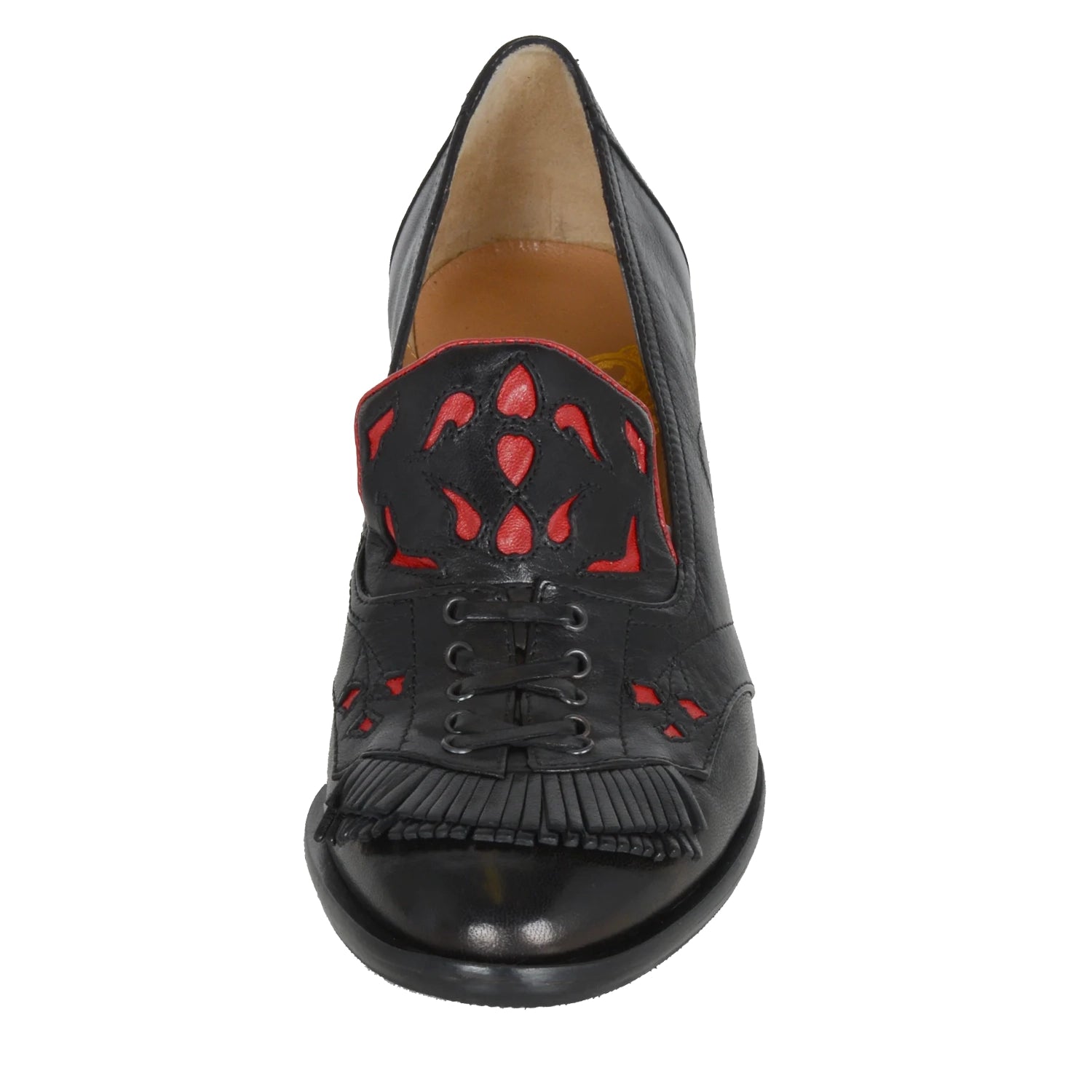 Bunadsko i mykt skinn. Flotte dufser foran og høy hel. Sort skinn med røde detaljer.
